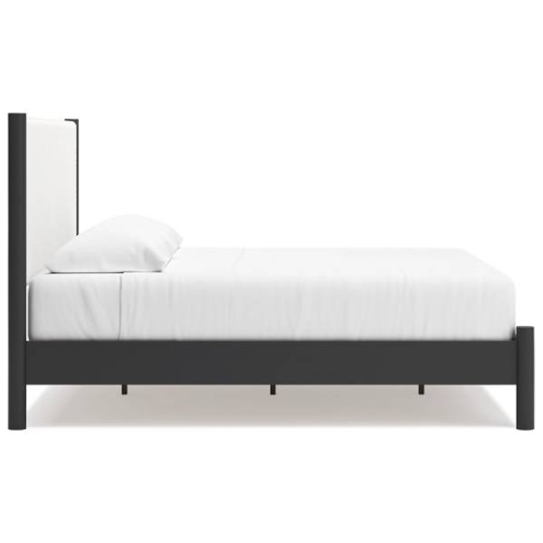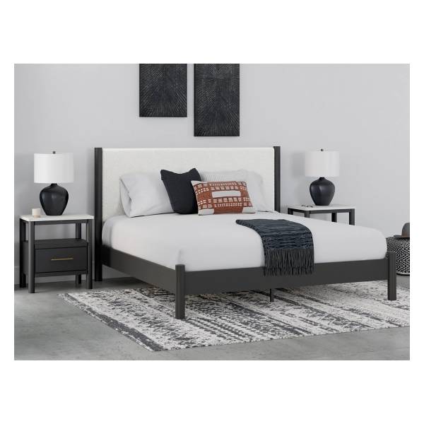 The Cadmori King Upholstered Panel Bed is a masterpiece of modern boho design, perfectly blending style and functionality to elevate your bedroom's aesthetic. With its sophisticated charm, this bed embodies the essence of laid-back luxury and free-spirited elegance. The crisp white upholstery of the headboard offers a striking contrast to the matte black frame, creating a versatile look that harmonizes with all-neutral palettes or vibrant pops of color. Whether you’re aiming for a serene retreat or a bold design statement, this bed is your ideal centerpiece.