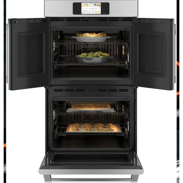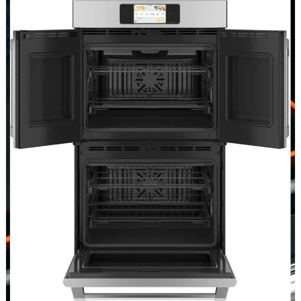 Cafe CTD90FP2NS1 Double Wall Oven, 30 inch Exterior Width, Both Ovens Convection, Self Clean, 10.0 cu. ft. Capacity, Temperature Probe, Wifi Enabled, Stainless Steel colour Air Fry; True European Convection; Telescopic Gliding Extension Rack