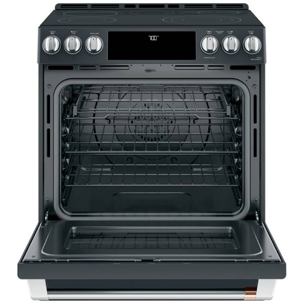 Cafe CCES700P3MD1 Electric Range, 30 inch Exterior Width, Self Clean, Convection, 4 Burners, 5.7 cu. ft. Capacity, Warming Drawer, 1 Ovens, Matte Black colour True European Convection Mode, Self Clean Racks