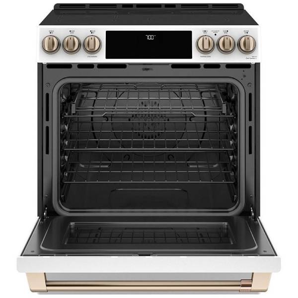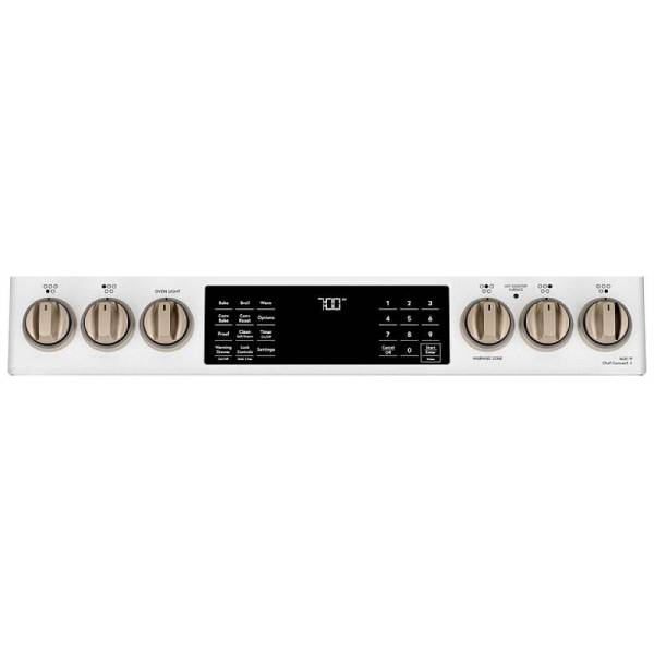 Cafe CCES700P4MW2 Electric Range, 30 inch Exterior Width, Self Clean, Convection, 5 Burners, 5.7 cu. ft. Capacity, Warming Drawer, 1 Ovens, Matte White colour Temperature Probe, True European Convection, Self Clean Racks