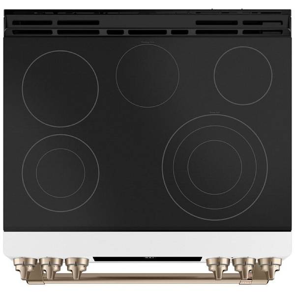 Cafe CCES700P4MW2 Electric Range, 30 inch Exterior Width, Self Clean, Convection, 5 Burners, 5.7 cu. ft. Capacity, Warming Drawer, 1 Oven, Matte White Color, Temperature Probe, True European Convection, Self Clean Racks