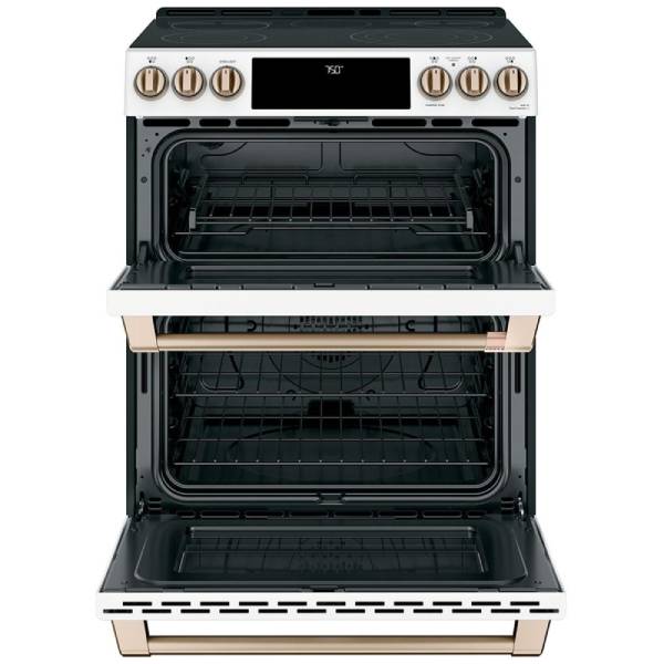Cafe CCES750P4MW2 Electric Range, 30 inch Exterior Width, Self Clean, Convection, 5 Burners, 7.0 cu. ft. Capacity, 2 Ovens, Matte White colour Telescopic Gliding Extension Rack, True European Convection, Self Clean Racks