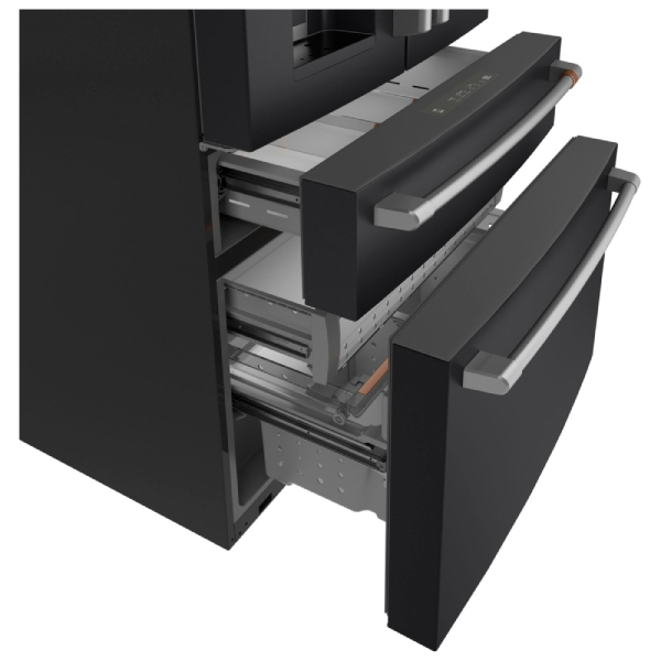 Introducing the Café CXE22DP3PD1 French Door Refrigerator, offering unparalleled style and innovative features that redefine your kitchen experience. Crafted with sophistication in mind, this 36-inch, ENERGY STAR Certified refrigerator in Matte Black seamlessly blends into your kitchen decor with its counter-depth design, creating a built-in look that's both sleek and functional.