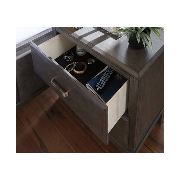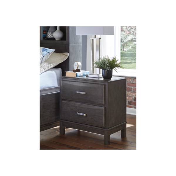 Elevate your bedroom with the sleek sophistication of the Caitbrook Two Drawer Nightstand, available exclusively at Teletime. Crafted with contemporary elegance and thoughtful functionality, this nightstand brings a refined yet relaxed presence to any space. Its beautifully contoured drawer fronts and clean-lined silhouette reflect modern design sensibilities, while the rich weathered gray finish offers a warm and inviting touch. The linear metal drawer pulls in a bright nickel-tone finish add a striking contrast, enhancing the nightstand’s stylish appeal.