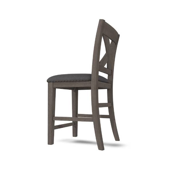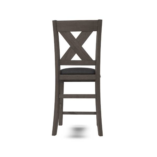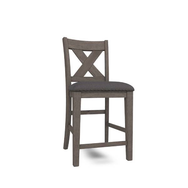 This bar stool combines relaxed elegance with modern farmhouse charm, featuring a gray-washed wood frame, textured gray fabric upholstery, foam cushioning, and classic X-back styling, all with nailhead trim.