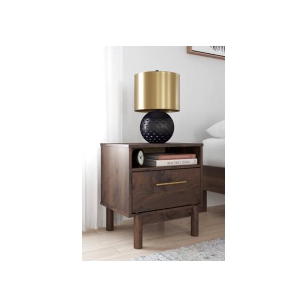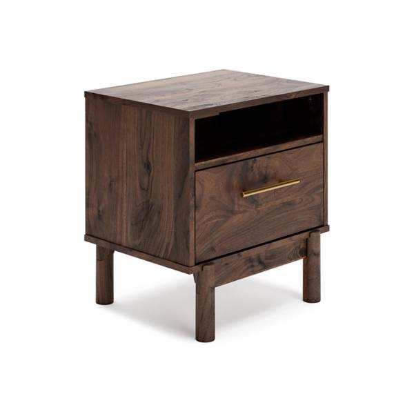 Striking the perfect balance between industrial charm and contemporary sophistication, the Calverson One Drawer Nightstand adds a refined touch to your bedroom, available now at Teletime. Its rich brown finish over replicated walnut wood grain delivers a warm and inviting look, beautifully complementing various interior styles. Designed for both style and function, this nightstand is a statement piece that enhances your space while providing essential bedside storage.