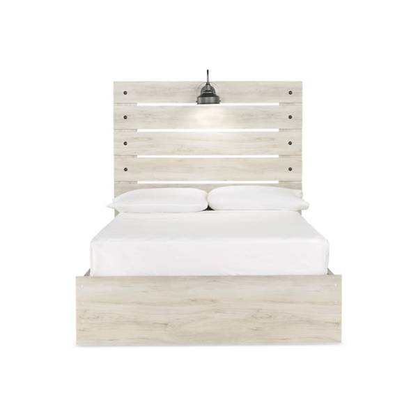 The Cambeck Full Panel Bed seamlessly combines rustic charm with industrial flair, making it the perfect addition to any modern loft or farmhouse-inspired space. Its wispy white finish beautifully enhances the natural oak grain, giving the bed a weathered, lived-in look that adds warmth and character to your bedroom. The open-slat style headboard not only offers an eye-catching design but also features a retro-chic light sconce and slim-profile USB charging ports for a blend of functionality and style.