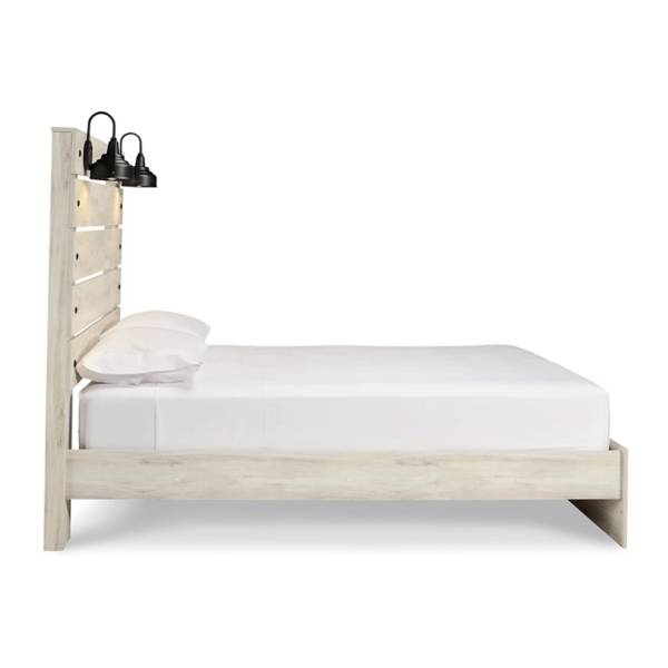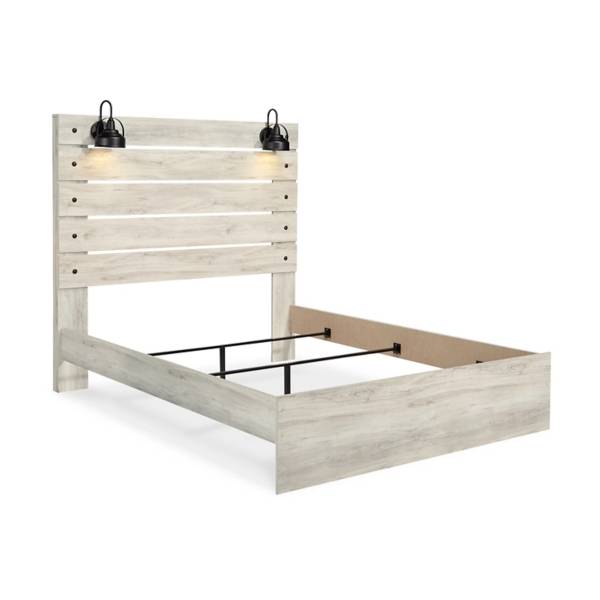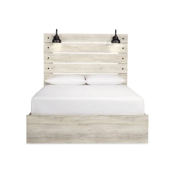 This queen panel bed features a rustic industrial style with a wispy whitewash finish, retro-chic sconce lights, and USB ports. Durable engineered wood construction and an open-slat headboard complete the design.