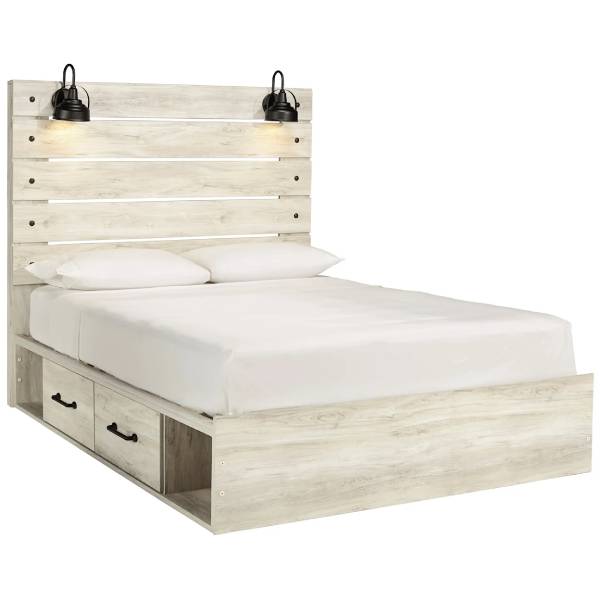 The Cambeck Queen Panel Bed with 2 Storage Drawers (SKU - B192B17) from Teletime combines rustic industrial style with practical features. Its wispy whitewash finish over replicated oak grain offers a weathered look that enhances any modern loft or farmhouse setting. This queen bed is designed with convenience in mind, featuring an open-slat style headboard equipped with retro-chic light sconces and USB plug-ins for added functionality.