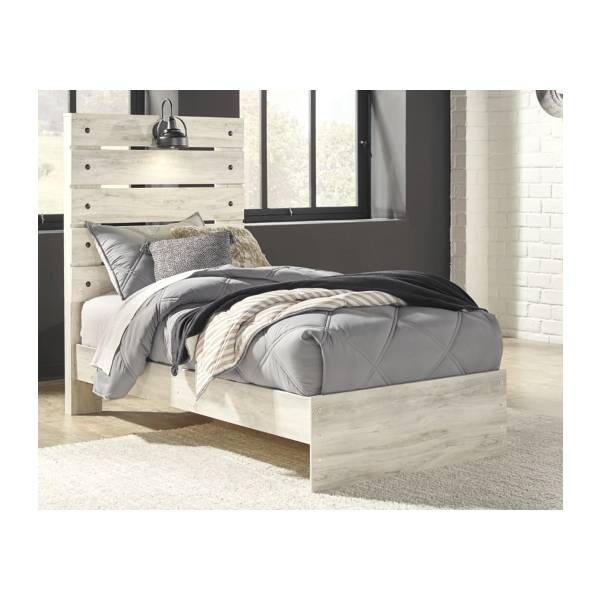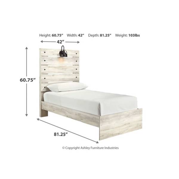 This twin panel bed features a rustic industrial style with a wispy whitewash finish, retro-chic sconce light, and USB ports. Durable engineered wood construction and an open-slat headboard enhance the design.