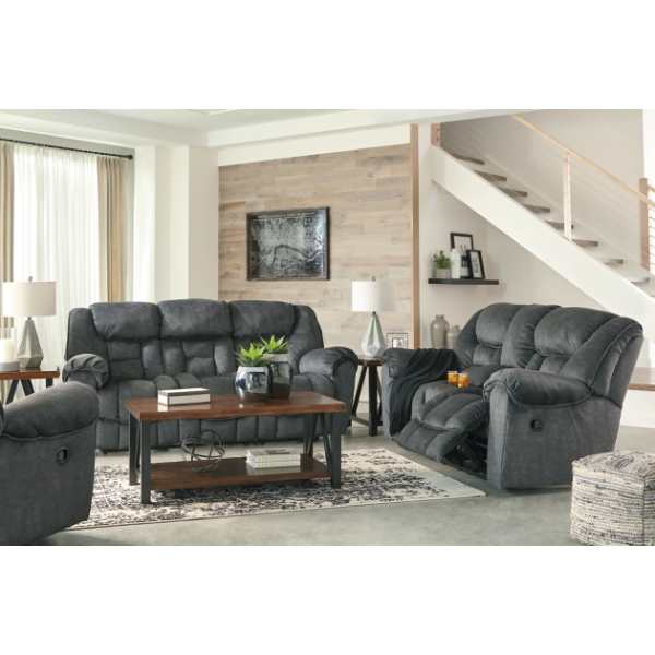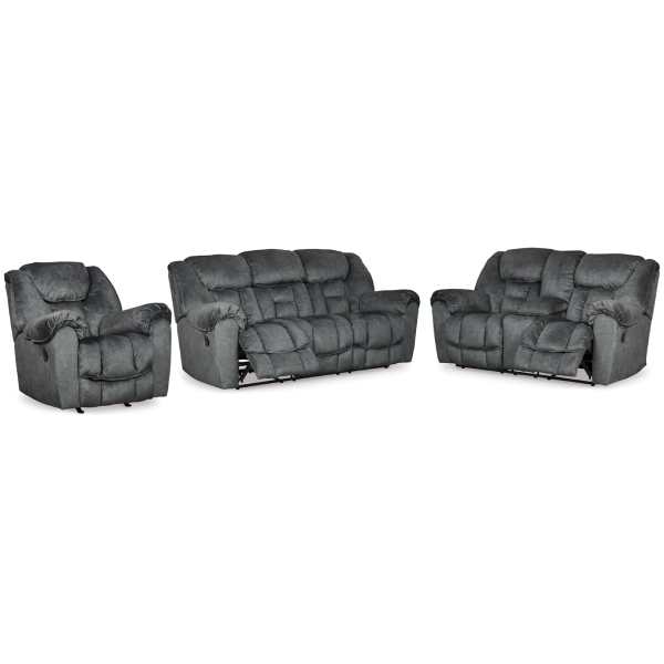 The Capehorn Sofa, Loveseat, and Recliner set delivers an indulgent lounging experience with its generously scaled design and plush granite gray upholstery. Built for ultimate comfort, each piece features scooped pillow-wrapped armrests and curvaceously cushioned head and neck support, ensuring a cozy and relaxing feel. The reclining sofa offers smooth pull-tab reclining motion, a sturdy corner-blocked frame with metal reinforcement, and high-quality foam cushions wrapped in poly fiber for lasting support. The double reclining loveseat adds extra convenience with dual-sided reclining, a lift-top storage console, and two cup holders, making it a perfect spot for movie nights or casual gatherings. Completing the set, the rocker recliner enhances relaxation with a gentle rocking motion and easy pull-tab reclining function, all while maintaining the same durable construction and ultra-soft polyester upholstery. Whether you're unwinding solo or entertaining guests, this collection offers the perfect blend of style, comfort, and functionality.
