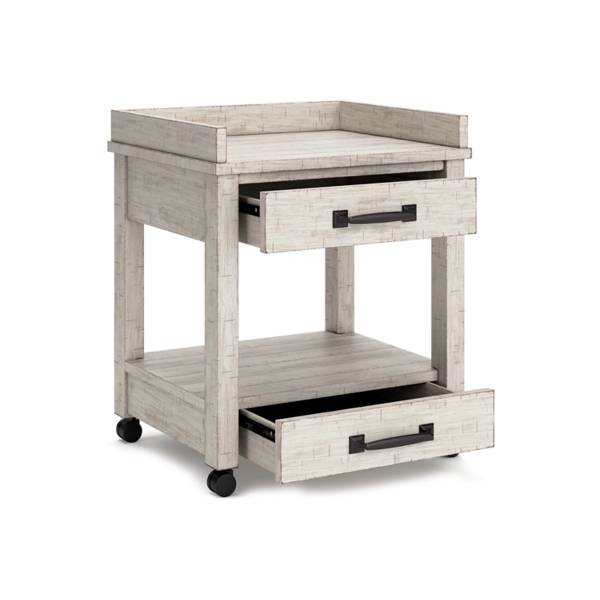 This modern farmhouse printer stand features a distressed whitewash finish, two smooth-gliding dovetail drawers, open shelves, casters, and built-in electrical outlets with USB ports for convenience and mobility.