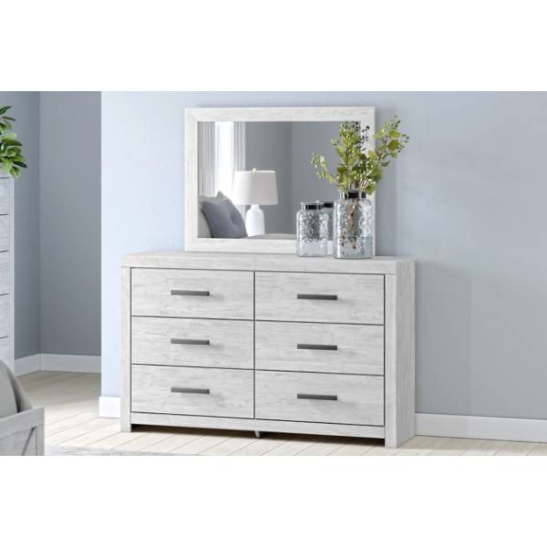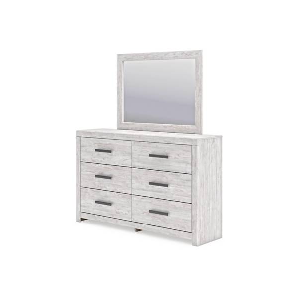 The Cayboni Dresser and Mirror showcases a contemporary design with a richly textured wood grain finish.Its spacious drawers provide ample storage while maintaining a refined, sleek silhouette.Built for durability, this piece seamlessly blends functionality and modern charm.