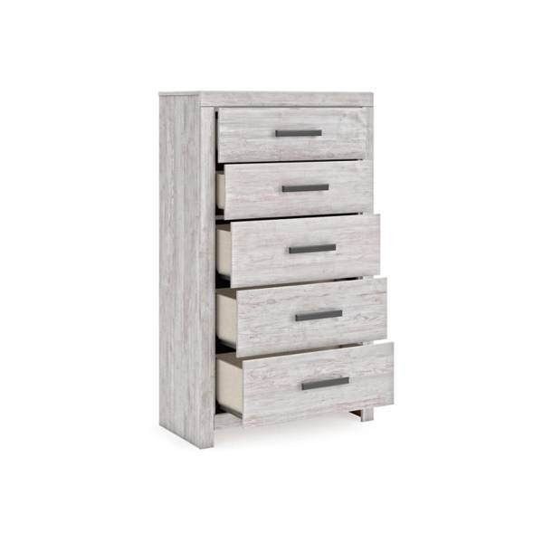 Designed with both style and safety in mind, this chest adheres to the latest ASTM F 2057 standards for stability, offering peace of mind for family-friendly living. The drawers are designed to extend fully for maximum access while maintaining stability for safe usage. With minimal assembly required, the Cayboni Five Drawer Chest is a stylish, functional, and dependable storage solution available exclusively at Teletime, perfect for elevating your bedroom décor.
