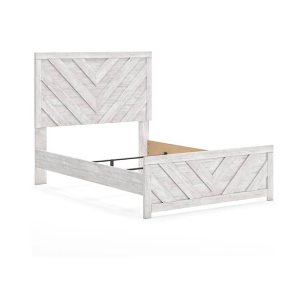 The Cayboni Full Panel Bed from Teletime brings the timeless charm of countryside living into your modern space. Finished in a beautifully weathered whitewash, it captures the essence of vintage character with its rustic appeal. The bed’s design incorporates a chic chevron pattern on the headboard and footboard, adding a contemporary flair that keeps your bedroom stylish and on-trend.