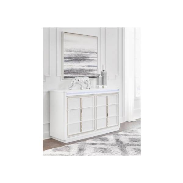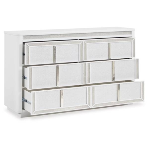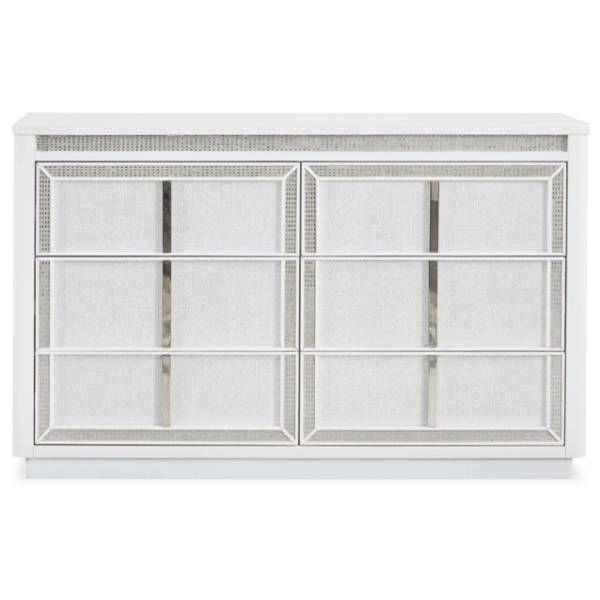 The Chalanna Dresser is a modern and glamorous piece designed to enhance your bedroom decor. It features built-in LED lighting with a dimmer switch, rhinestone-framed drawers, and a bright white lacquer finish. The dresser offers six spacious drawers with fully finished interiors and heavy-duty ball-bearing side glides for smooth operation