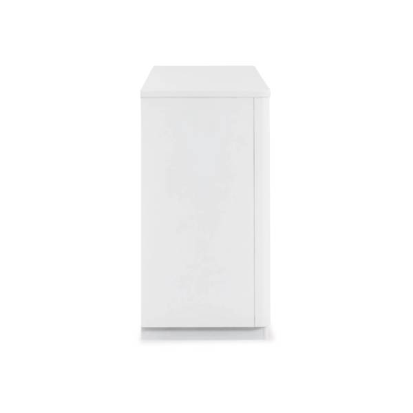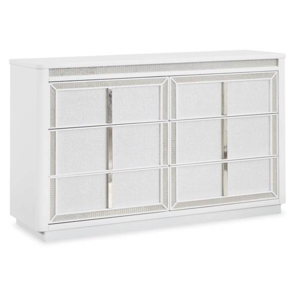 Elevate your bedroom into a sanctuary of style and sophistication with the Chalanna Dresser, available at Teletime. This stunning piece embodies modern elegance, designed to transform your space into a glamorous retreat. Its radiant white lacquer finish provides a sleek and contemporary look, beautifully complemented by vertical metal drawer pulls that add a subtle touch of refinement.