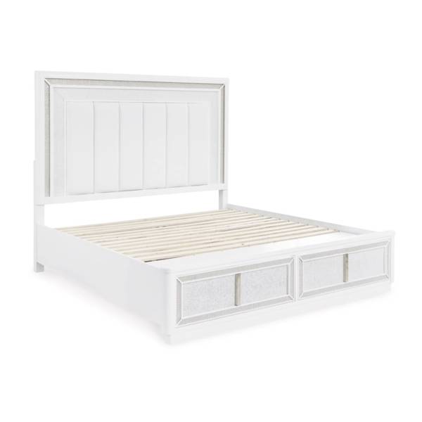 Not only does this bed exude luxury, but it also offers practical storage solutions. The storage footboard features two spacious drawers with textured laminate fronts and rhinestone accents. These drawers are built with dovetail construction and smooth ball-bearing side glides, ensuring durability and ease of use. The fully finished interior provides ample space to organize your belongings, keeping your bedroom tidy and stylish.
