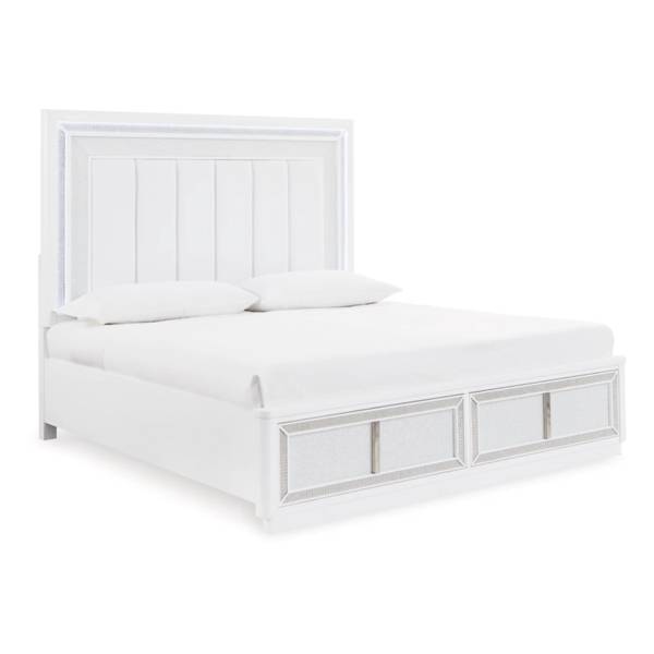 Elevate your bedroom with the Chalanna Queen Upholstered Storage Bed, a striking blend of modern glamour and functional design. With its sophisticated faux leather upholstery, accented by rhinestone framing and LED lighting, this bed adds a touch of sparkle to your sanctuary. The sleek, white lacquer finish enhances its contemporary appeal, while the built-in LED lighting, complete with a 3-way dimmer switch, creates a soft, ambient glow, setting the perfect mood for relaxation.