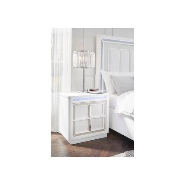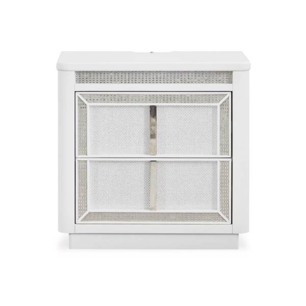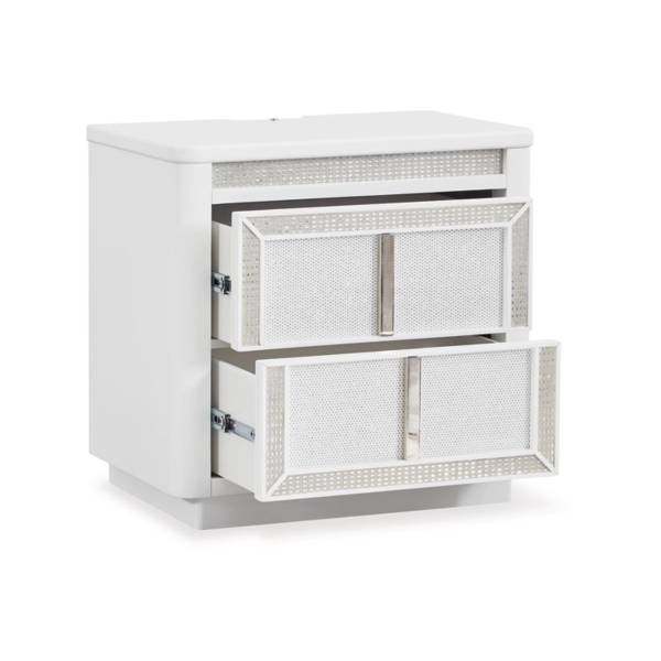 Add a touch of modern glamour to your bedroom with the Chalanna Two Drawer Nightstand, available exclusively at Teletime. Designed to elevate your space with its chic and contemporary flair, this nightstand blends functionality with radiant sophistication. The high-gloss white lacquer finish offers a clean, polished look, while rhinestone-framed drawers and textured laminate fronts provide a dazzling focal point that instantly brightens your room.