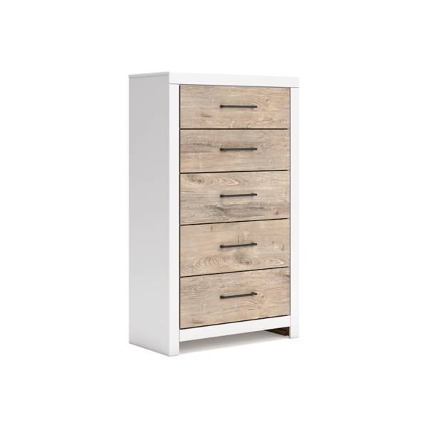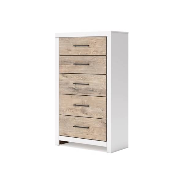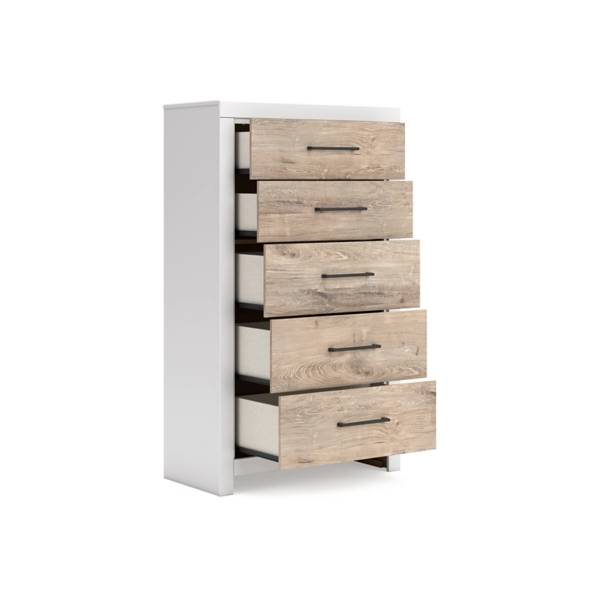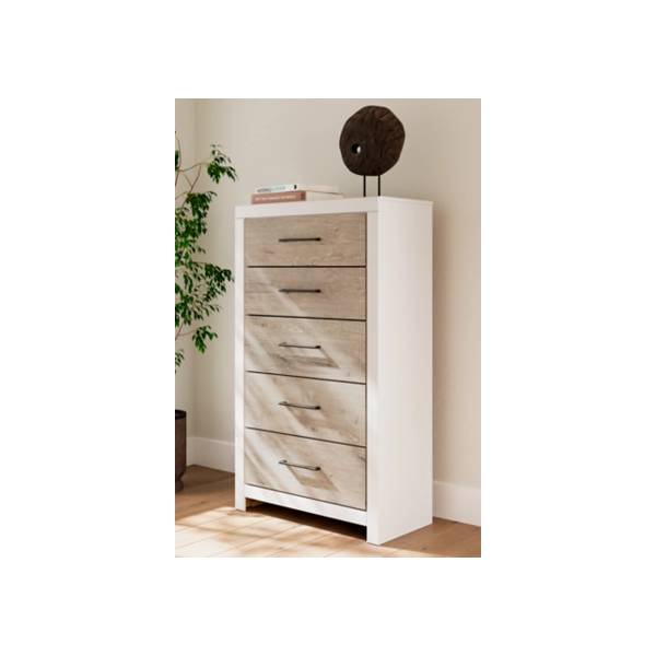 The Charbitt Five Drawer Chest, available at Teletime, brings a relaxed yet sophisticated charm to your bedroom. Its stunning two-tone design pairs a matte white finish with a fresh, replicated oak grain that exudes a natural and serene ambiance. Accentuated by sleek handles in an antiqued gunmetal finish, this chest seamlessly blends casual beauty with contemporary flair.