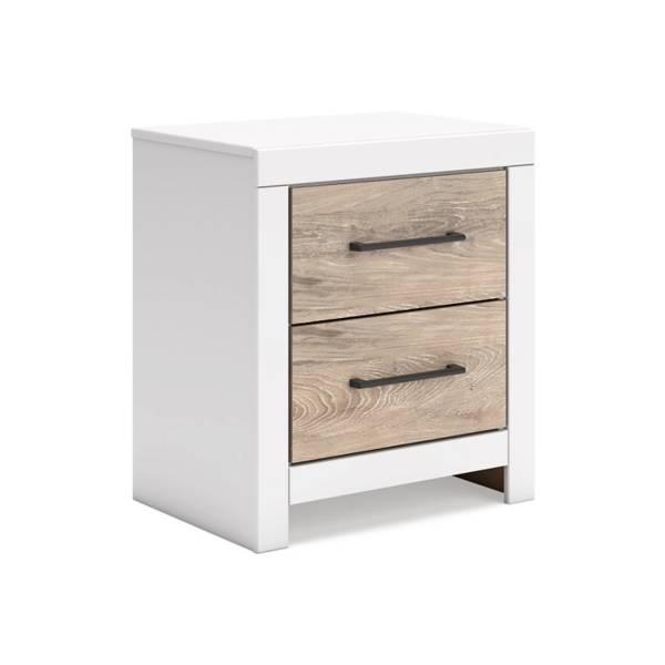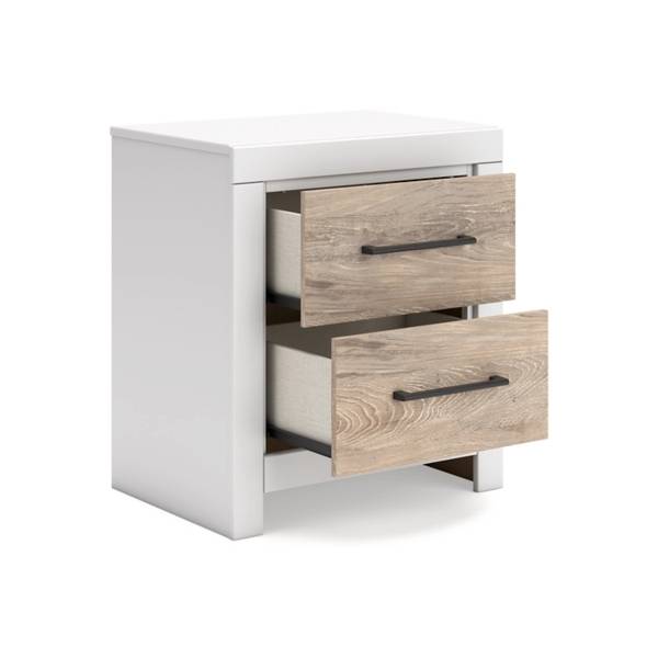 Bring a sense of casual elegance and modern functionality to your bedroom with the Charbitt Two Drawer Nightstand, available at Teletime. Thoughtfully designed with a fresh two-tone finish, this piece blends a dry, light oak grain with a clean matte white for a look that feels both relaxed and refined. Sleek, antiqued gunmetal handles add a contemporary edge, complementing the nightstand’s understated charm.