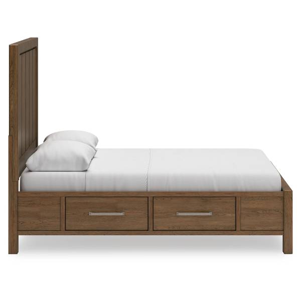 The Chirason Queen Panel Bed with Storage from Teletime effortlessly merges nostalgic style with modern design, making it an ideal addition to any contemporary bedroom. This bed's warm brown tones evoke the mid-century aesthetic you love, while the sleek panel design integrates modern motifs for a balanced, timeless look. The ultra-spacious storage in the footboard is a practical feature that keeps clutter at bay, and the integrated drawer handles lend a refined touch of sophistication to the overall design.