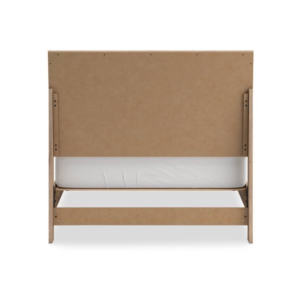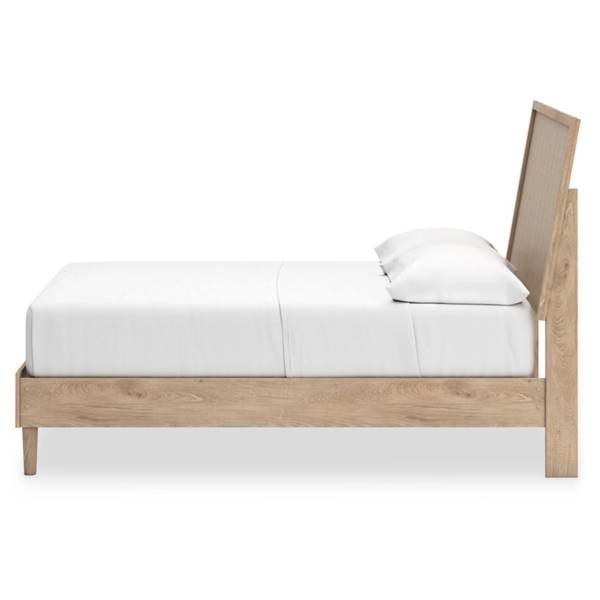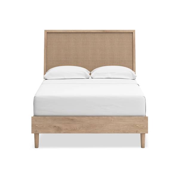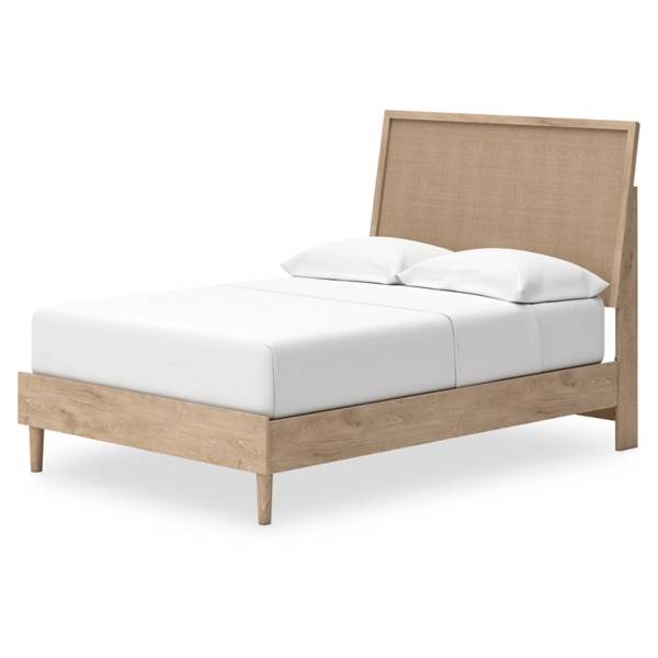 This full panel bed features a light finish with replicated oak grain, textured beige cane details, and durable engineered wood construction, offering a versatile, contemporary design for modern bedrooms.