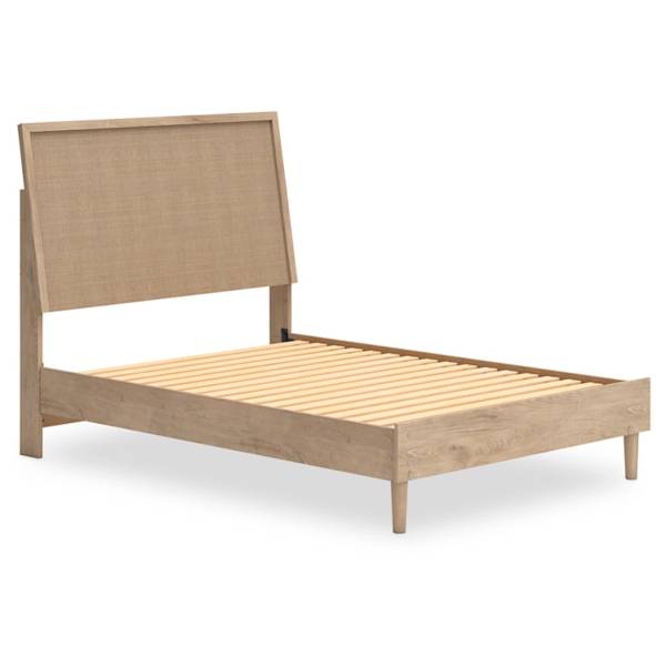Transform your bedroom with this full panel bed that combines clean-lined, contemporary design with a light finish, replicated oak grain, and textured beige cane details. Its mixed materials create a versatile, naturally stylish vibe that perfectly complements modern aesthetics.