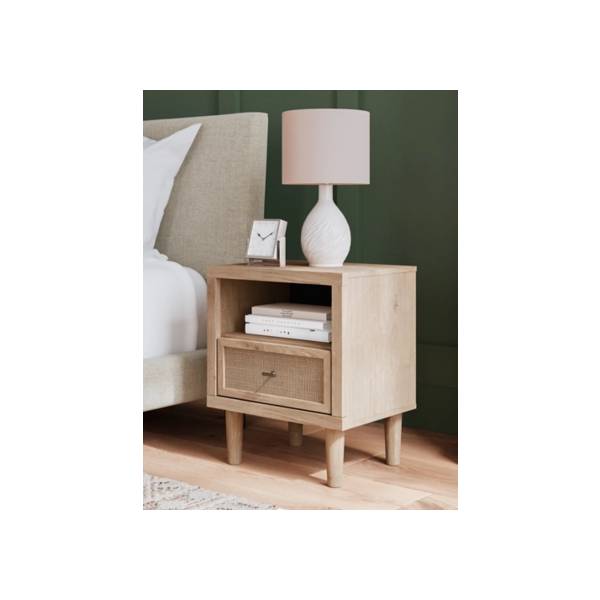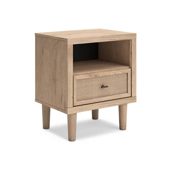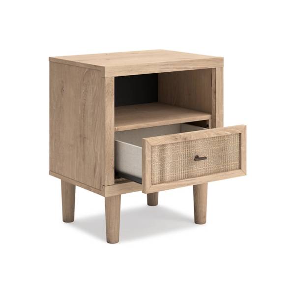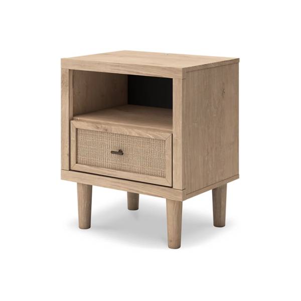 Infuse your bedroom with a refreshing blend of contemporary style and natural charm with the Cielden One Drawer Nightstand, available exclusively at Teletime. Designed to offer modern functionality with a warm, inviting aesthetic, this nightstand features a light dry finish that highlights a beautifully replicated oak grain. Accented with beige-textured details that mimic the look of woven cane, it delivers a layered, organic feel that effortlessly complements a variety of bedroom styles.