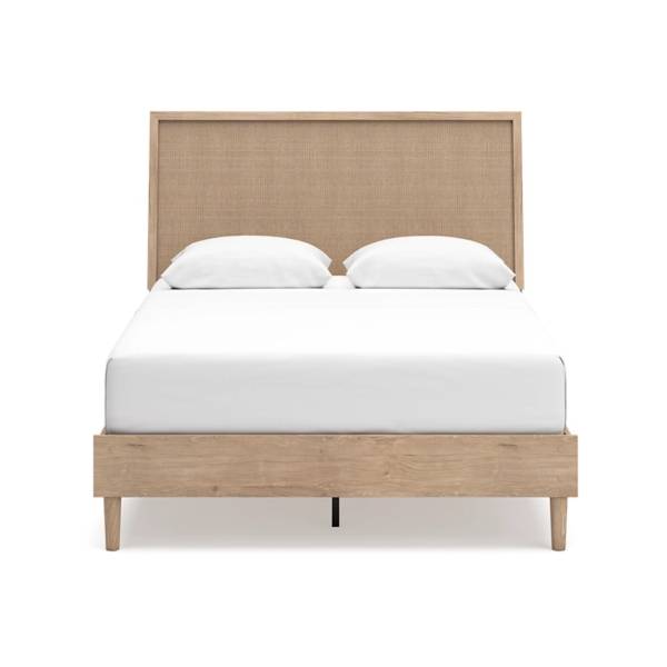 This contemporary queen panel bed features a light finish with replicated oak grain and textured beige cane details, offering a stylish and versatile design that enhances any modern bedroom retreat.