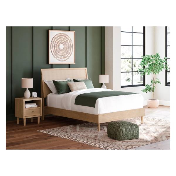 Embrace a fresh style awakening with this contemporary queen panel bed, designed with clean lines that exude sophistication without sacrificing warmth. Featuring a light finish that beautifully showcases replicated oak grain, this bed is enhanced by textured beige cane accents, adding depth and dimension to your bedroom.