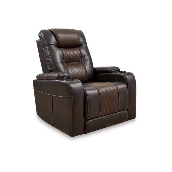 Sleek lattice stitching adds a modern touch, and ambient blue LED lighting on the cup holders and base enhances the theater-style atmosphere. Built for durability and long-lasting comfort, the power recliner features a corner-blocked frame with a metal-reinforced seat and high-resiliency foam cushions wrapped in thick poly fiber. The attached cushions provide consistent support, and the faux leather upholstery offers a stylish, easy-to-maintain finish.