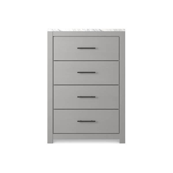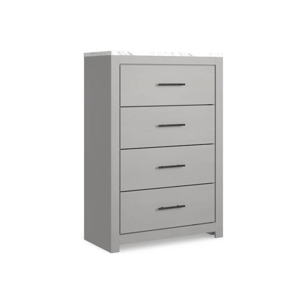 Transform your bedroom into a serene retreat with the Cottonburg Four Drawer Chest, available exclusively at Teletime. Its wispy dove gray finish elegantly replicates natural wood grain, while the faux Calcutta marble top adds a refined touch, creating a sophisticated yet calming aesthetic. Bold, large-scale dark handles further enhance the sleek design, making it a standout piece in any modern space.