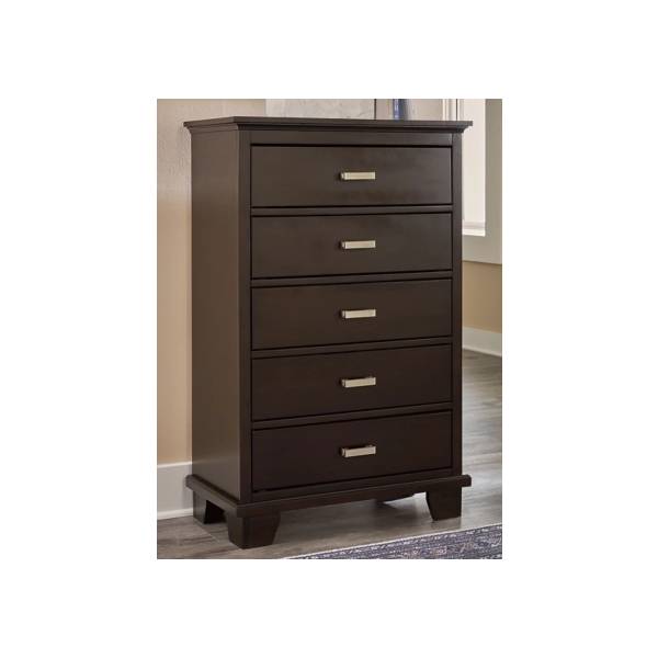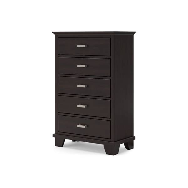 Elevate your bedroom with the timeless elegance of the Covetown Five Drawer Chest. Designed to blend traditional charm with modern refinement, this piece features a rich dark brown finish that exudes warmth and sophistication. Complementing its deep tones, bright nickel-tone metal bar pulls add a contemporary touch, striking the perfect balance between classic and modern style.