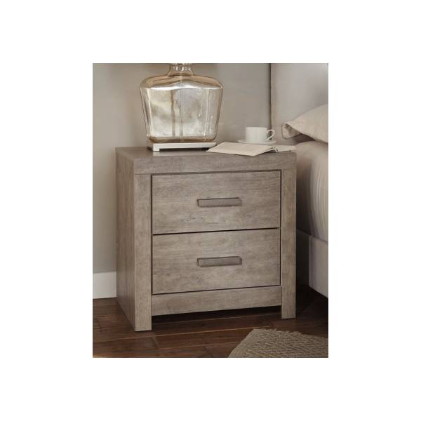 Bring a sense of calm sophistication to your bedroom with the Culverbach Two Drawer Nightstand, available at Teletime. Designed to complement serene and contemporary spaces, this nightstand features a beautifully weathered driftwood finish that evokes a soft, ethereal charm. The warm vintage gray tone, enhanced with a subtle pearl effect over a replicated cherry grain, adds a refined touch that blends effortlessly with a variety of bedroom décors.