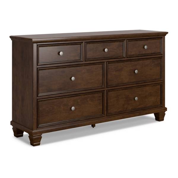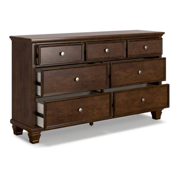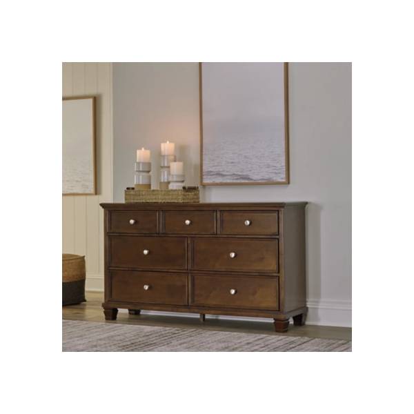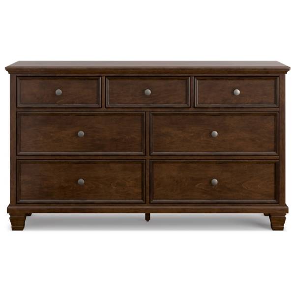 The Danabrin Dresser, available at Teletime, brings timeless charm to your bedroom with its casually refined design. Crafted to blend seamlessly with modern farmhouse or classic American aesthetics, this piece offers both enduring style and functionality. Its warm brownish cherry finish adds richness to your space, while the framed drawer fronts create striking dimension that elevates the overall look.