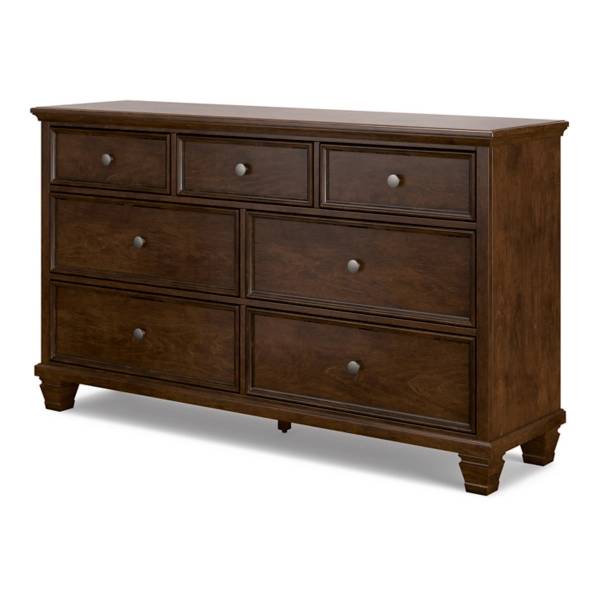 Built with hardwood solids, birch veneer, and a sturdy MDF substrate, the dresser promises long-lasting durability. Seven spacious drawers glide smoothly on ball-bearing slides, providing ample room for clothing and essentials. The dovetail construction ensures strength, while round metal knobs with a satin nickel-tone finish add a subtle touch of elegance. Resting on tapered feet, the Danabrin Dresser strikes the perfect balance between sophistication and everyday practicality, making it a beautiful and functional addition to any restful retreat.