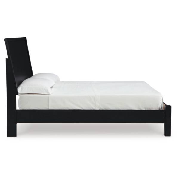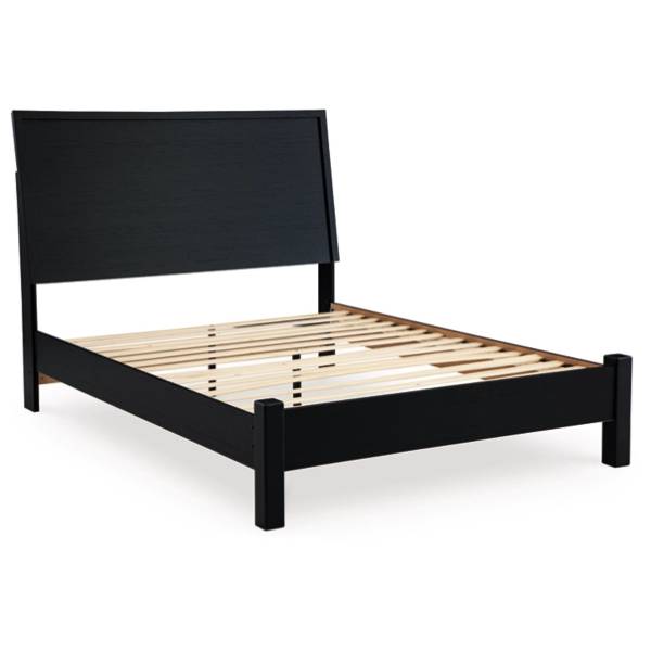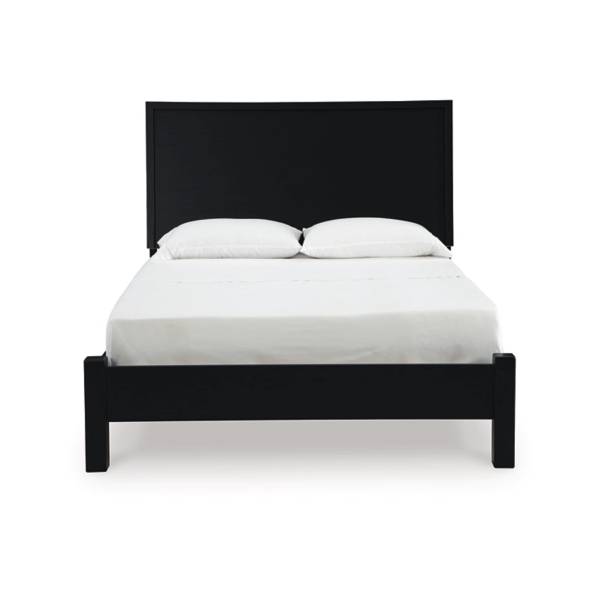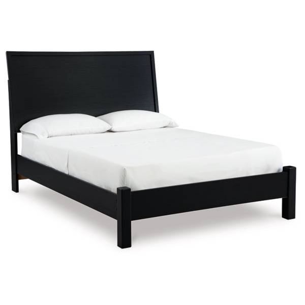 The Danziar Queen Panel Bed effortlessly blends sleek modern design with practical affordability, making it the ideal choice for anyone seeking both style and value. Its subtle, replicated wood grain texture adds a natural touch, while the clean lines of the bed’s structure create a minimalist yet sophisticated silhouette. Finished in a matte black hue, this bed's timeless aesthetic is versatile enough to complement various bedroom styles. Whether paired with bright, airy accents or darker tones for a more intimate atmosphere, this bed offers endless design possibilities.