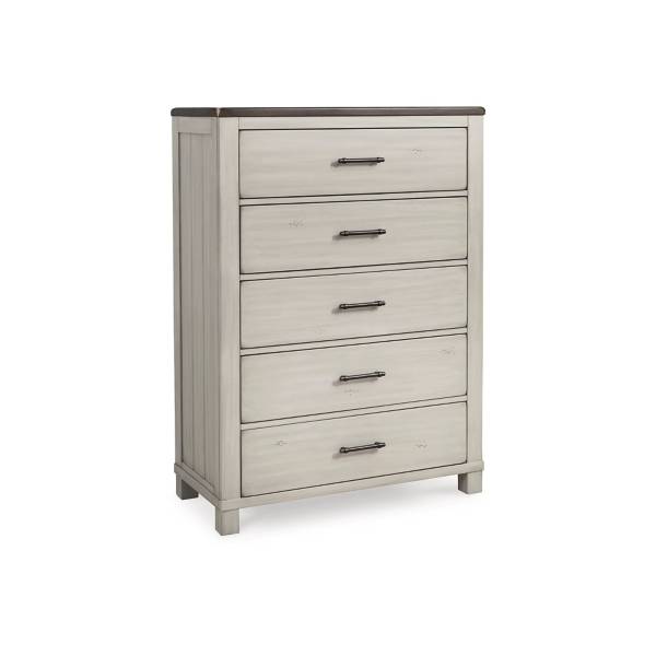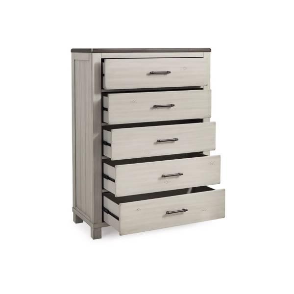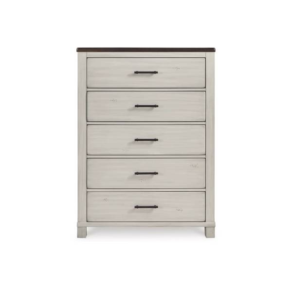 The Darborn Five Drawer Chest offers spacious storage with an elegant two-tone finish that adds a vintage charm to any bedroom. Crafted from solid acacia wood, cherry veneer, and MDF substrates, it ensures durable and functional use. The chest features five smooth-gliding drawers with fully finished interiors and metal ball-bearing side glides; the top drawer includes a felt bottom for added luxury. Its sturdy construction guarantees long-lasting stability and timeless appeal.