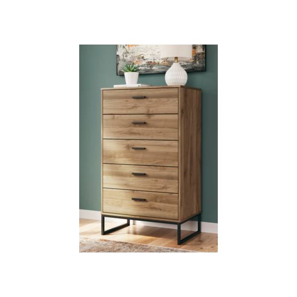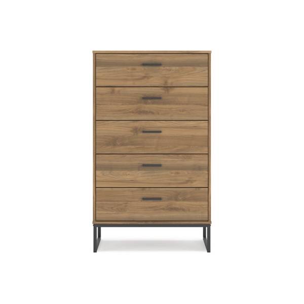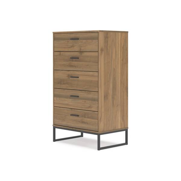 Transform your bedroom with the sleek charm of the Deanlow Five Drawer Chest, exclusively available at Teletime. If you're a fan of mid-century modern design with an industrial edge, this piece will effortlessly elevate your space. Its clean lines and rich tones invite you to embrace a relaxed yet sophisticated vibe.