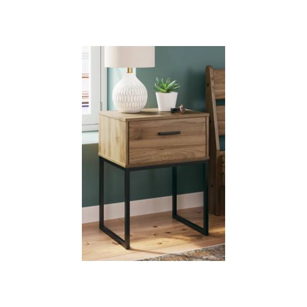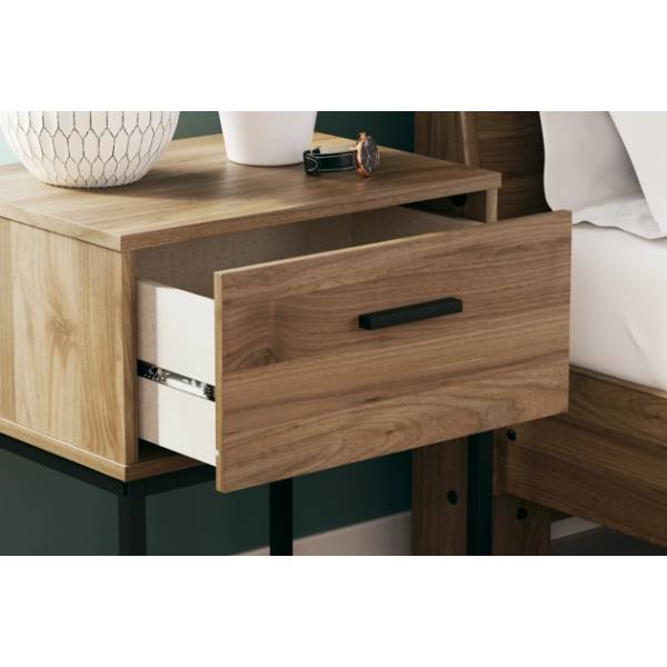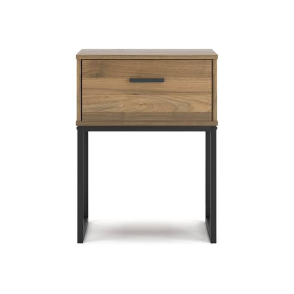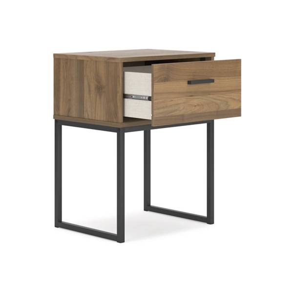 Built with engineered wood and decorative laminate, the Deanlow Nightstand is designed for lasting use. The smooth-gliding drawer, finished with vinyl-wrapped sides and back, provides ample storage for essentials while maintaining a sleek look. A dark pewter-tone handle complements the design, adding a refined contrast to the warm finish. Resting on sturdy metal legs, this piece not only boasts an airy and modern feel but also ensures long-lasting stability.