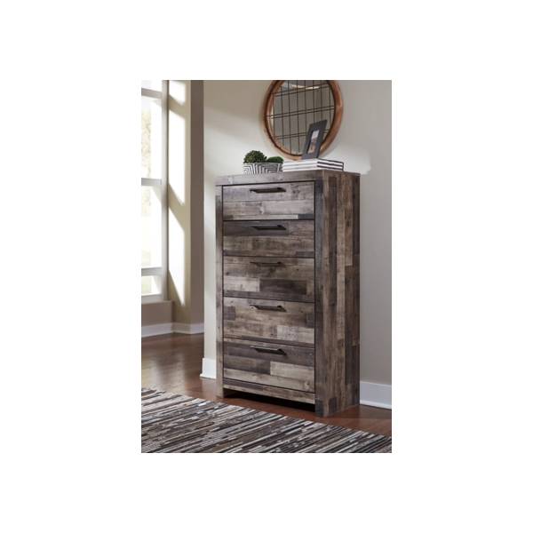 The Derekson Five Drawer Chest offers generous storage to keep your space organized and tidy. Crafted for durability, it promises long-lasting quality while its sleek design adds a modern touch to any room. This chest combines practical functionality with stylish elegance.