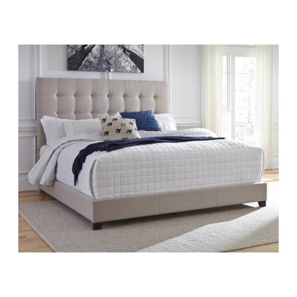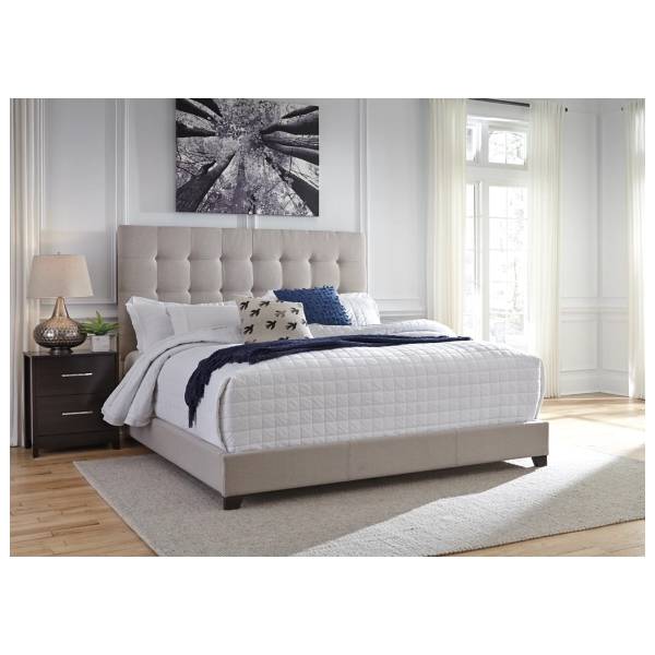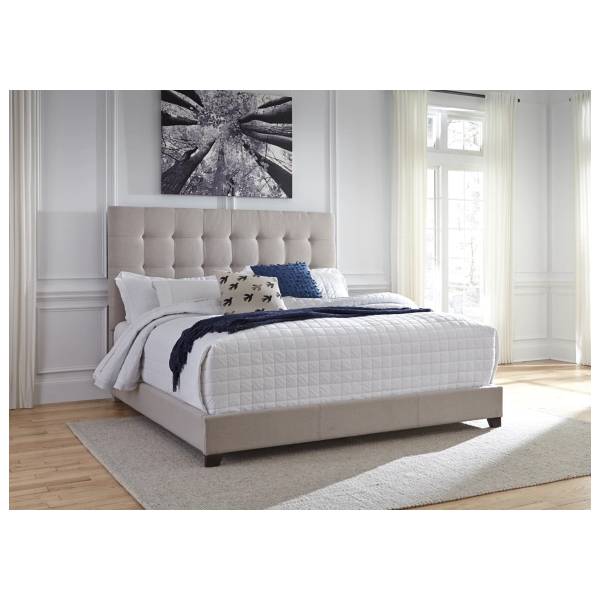 Introducing the Dolante Queen Upholstered Bed, a serene masterpiece that perfectly blends modern platform styling with a soft, inviting touch. Crafted with a soft pale beige fabric, this bed offers a gentle and calming presence in your bedroom. From the sophisticated headboard adorned with square button tufting to the sleek, low footboard and side rails, every element of this bed exudes elegance and tranquility.