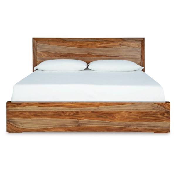 The Dressonni Queen Panel Bed brings a refined, modern touch to your bedroom with its clean lines and natural beauty. Crafted with sheesham wood, veneer, and MDF substrates, this bed celebrates the inherent charm of the wood, with a clear natural wood-tone finish that enhances its organic appeal. The low-profile design, with its striking simplicity, creates an understated modern look that is both timeless and elegant. This bed serves as the perfect foundation for your restful retreat, bringing a peaceful ambiance to your space.