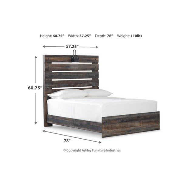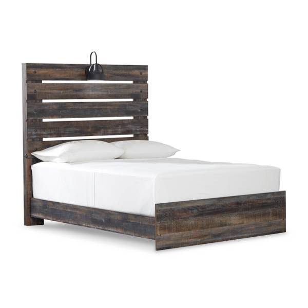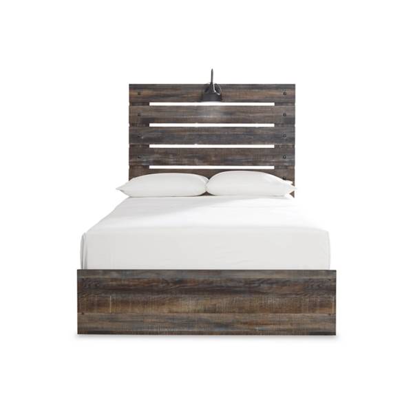This full panel bed combines rustic and industrial design with a barn board-inspired look. The replicated wood grain, highlighted with burnt orange and teal tones, brings a weatherworn authenticity to any bedroom.