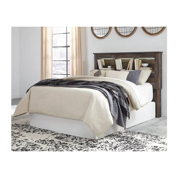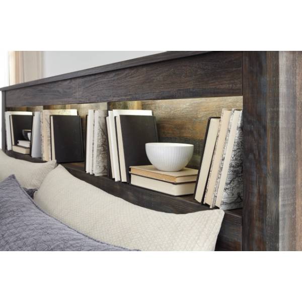 The Drystan Queen Bookcase Headboard brings rustic charm with a warm, weathered finish and built-in shelving for added functionality. Integrated LED lighting enhances ambiance while providing a convenient night-time glow. Its durable design ensures long-lasting style and practicality for any bedroom.