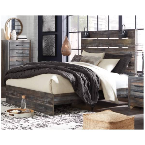 This queen panel bed beautifully blends rustic and industrial design, showcasing a barn board-inspired look. The replicated wood grain, enhanced with burnt orange and teal accents, adds a touch of weatherworn authenticity to your bedroom.