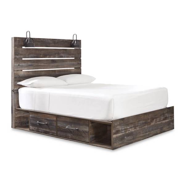 Assembly is required, and a mattress is sold separately. The Drystan Queen Panel Bed offers a unique blend of rustic charm, industrial flair, and practical features, making it an excellent choice for both style and storage. Available exclusively at Teletime.