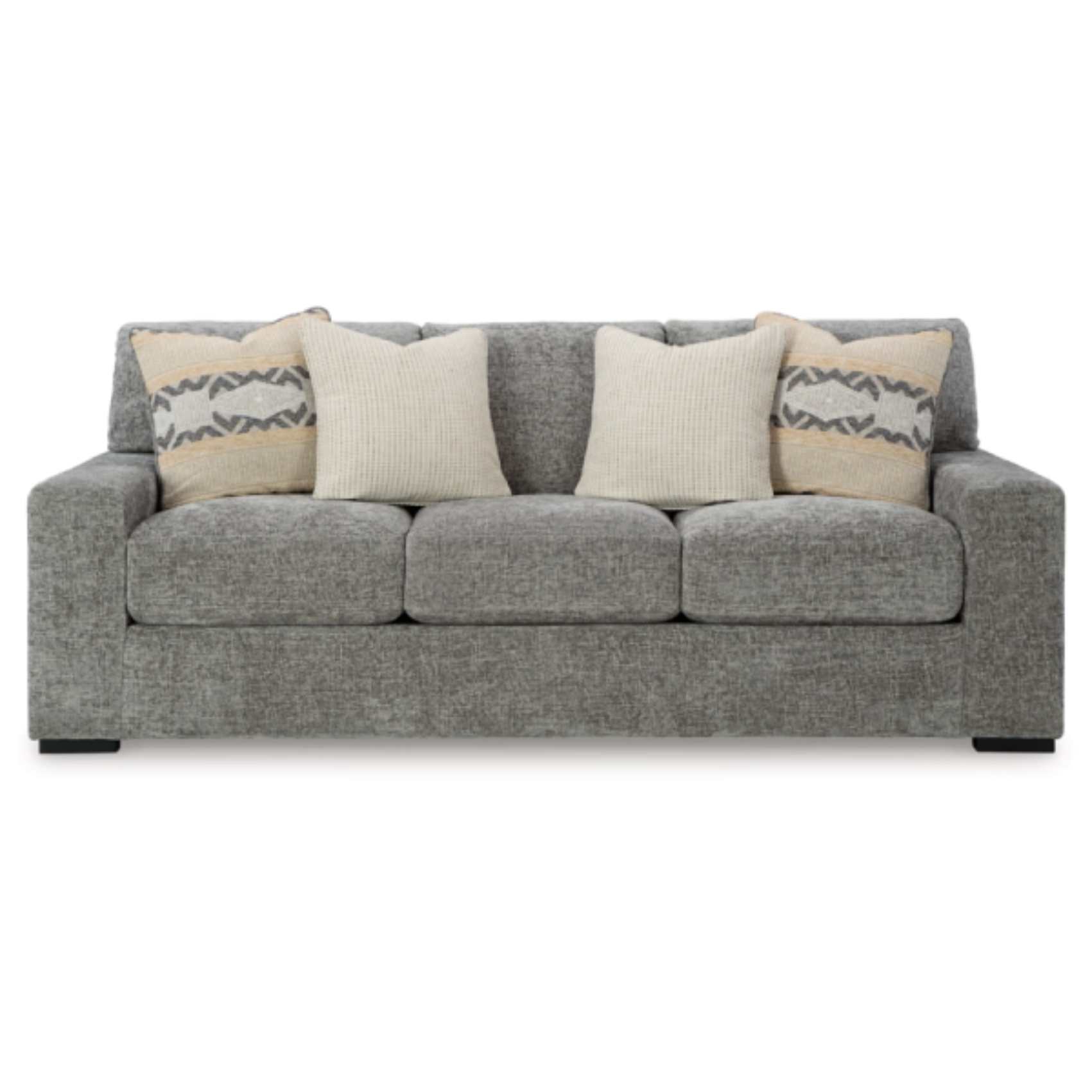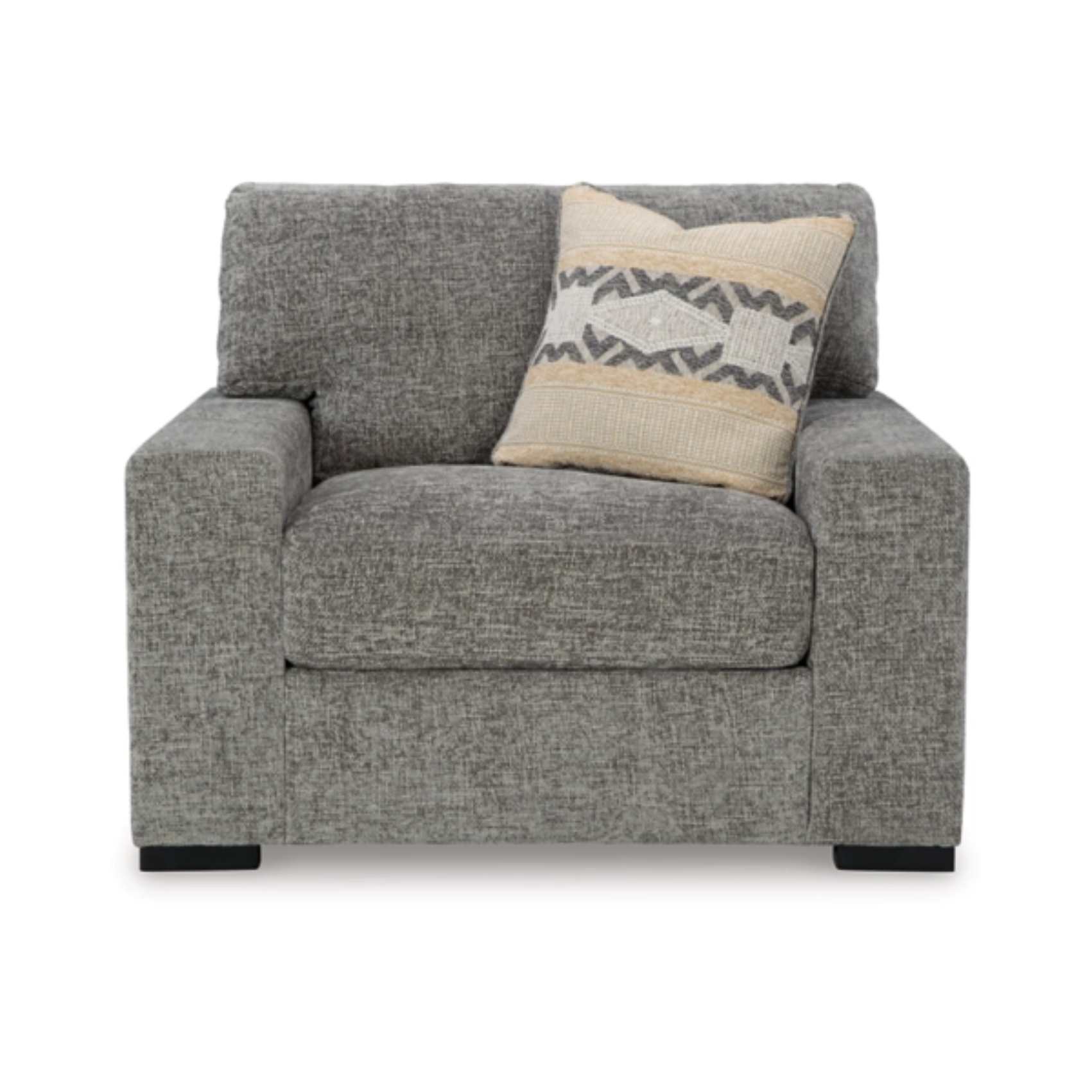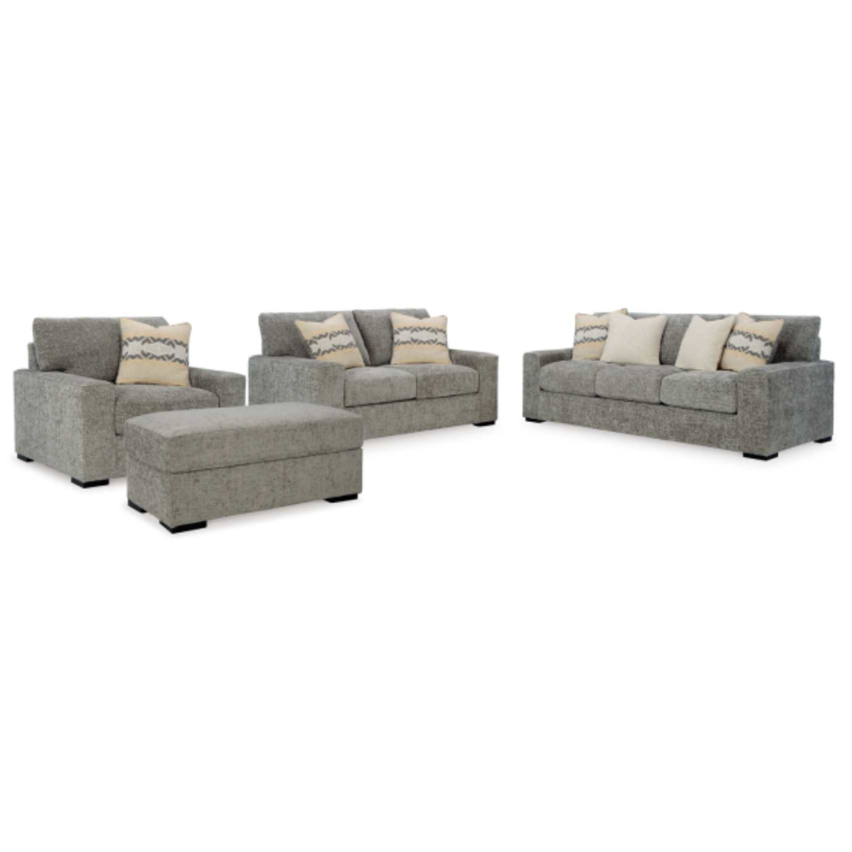 The Dunmor Sofa, Loveseat, Chair, and Ottoman (SKU - PKG016450) set offers deep seating with plush upholstery in a stylish graphite color. Its durable construction ensures long-lasting comfort, making it a practical addition to any living space. The spacious ottoman adds versatility, serving as a footrest or additional seating.